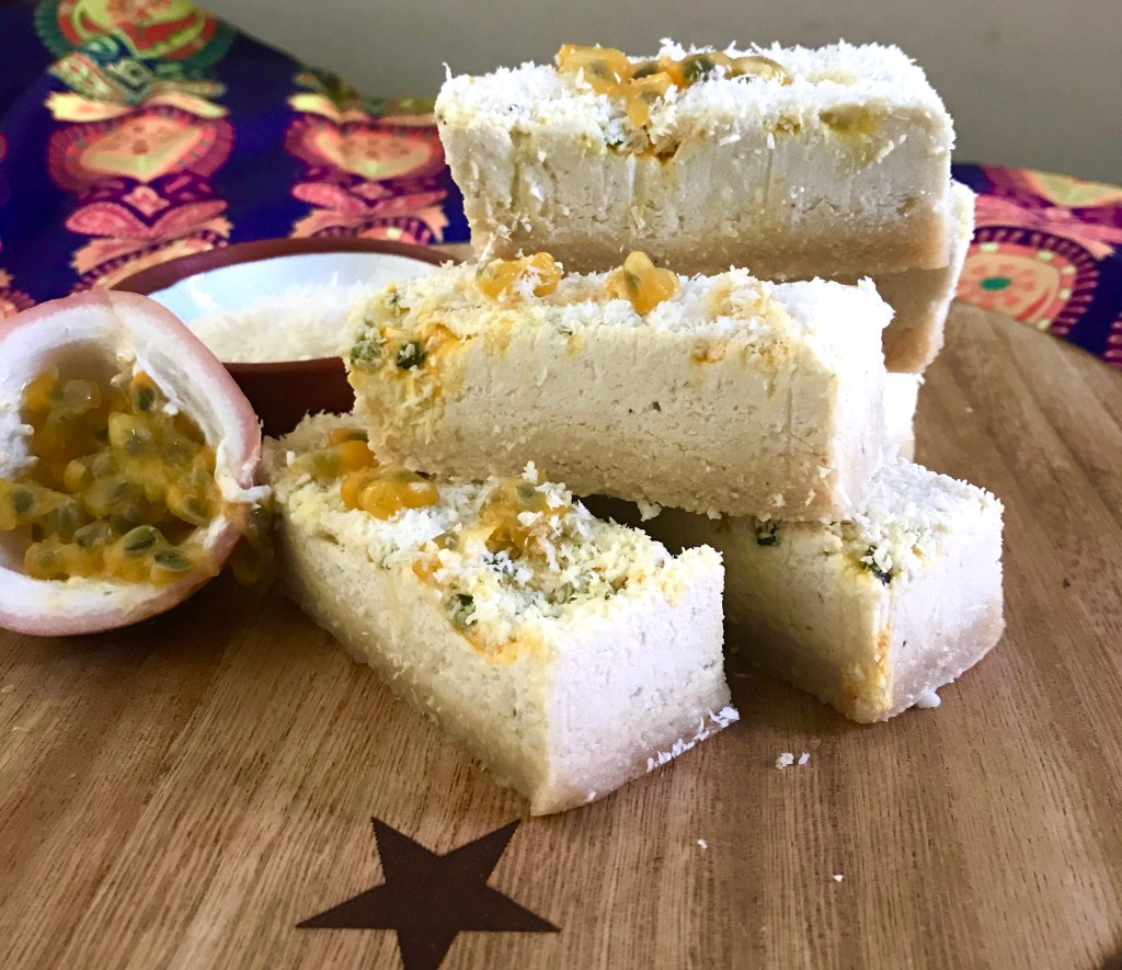 - Blend all these ingredients together for around 4-5 minutes until smooth. Pour over the base then scoop out 3-4 passionfruit and spread over the top. With a skewer or the end of a spoon gentle mix the passionfruit then sprinkle coconut over the top. Place in the refrigerator for at least 4 hours or until set. Cut the slice and enjoy! This slice can also be frozen.