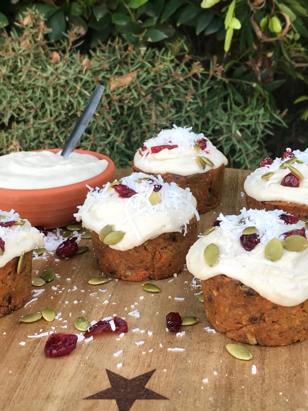 Blend all these ingredients together until nice and creamy- it can take around 5minutes. Spread along the top of your slice and refrigerate for over 4 hours before cutting. If you’re putting your icing on individual moulds you will have to refrigerate your icing in a bowl for around 4 hours until it is set ready to scoop on top of your carrot cakes. Then decorate with some pumpkin seeds cranberries and coconut. Enjoy these delicious treats xx