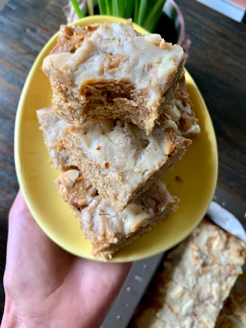 In a small bowl whisk together 50g soften vegan cream cheese with 1/2 tablespoon maple syrup Pour this over the slice and gentle swirl it through the top of the blondie mixture, I used a skewer. I also chopped up another 20g white chocolate and sprinkled it over the top! (See the picture on the right – this is how mine looked) It is now ready for the oven, place in your pre heated oven for 25 minutes.