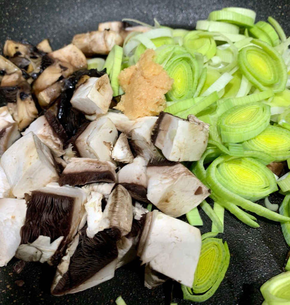 Pan fry off the mushroom and leek in some EVO and the coconut sugar – I add another teaspoon of garlic too, because I love garlic 🙂