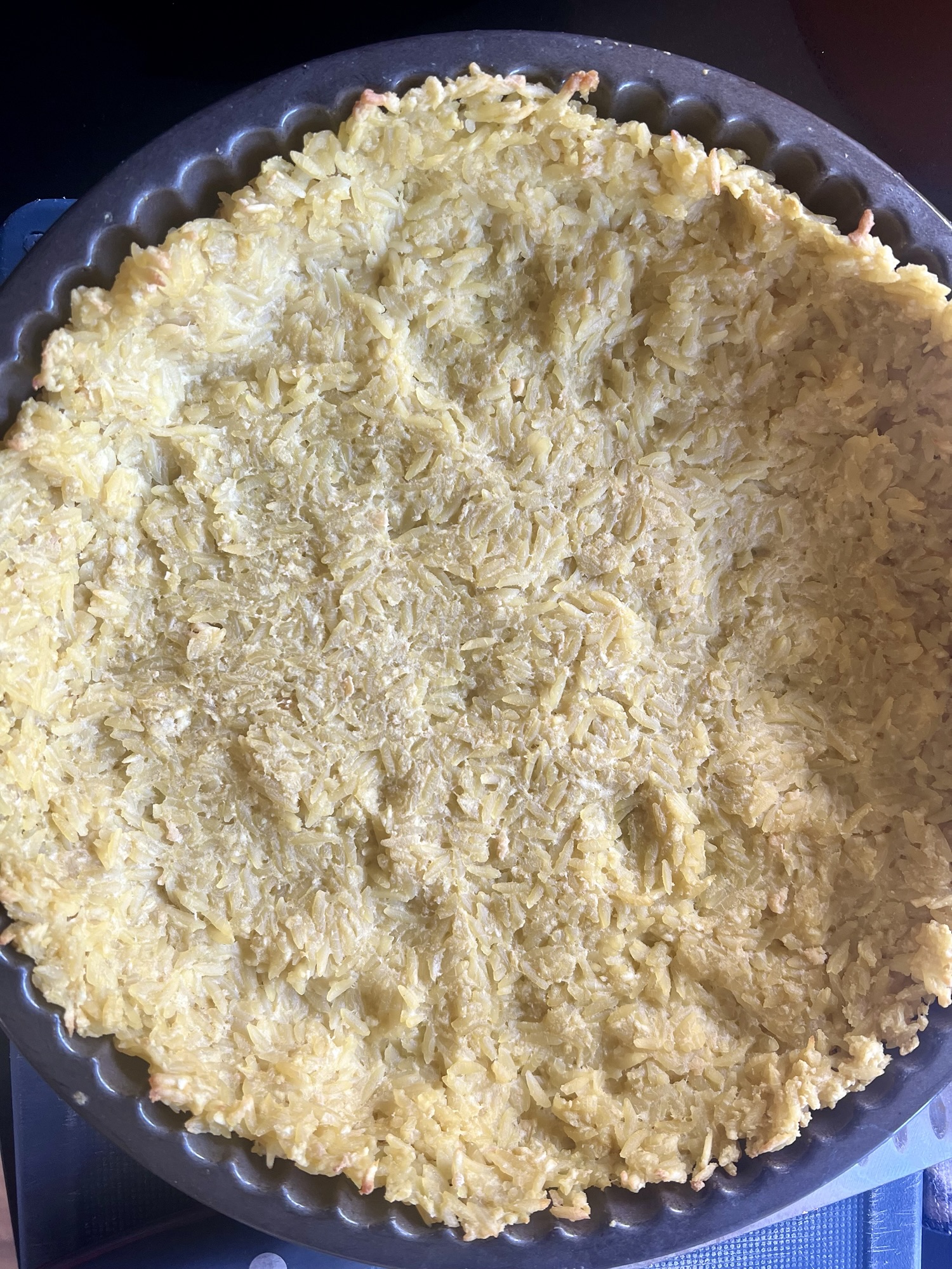 Blend soft tofu to a liquid. In a large bowl add the cooled cooked Risoni with the blended tofu and mix together. Next add the nutritional yeast and breadcrumbs, give it a stir. Press the mixture evenly into the tart pan. Place in the oven for 20 minutes.