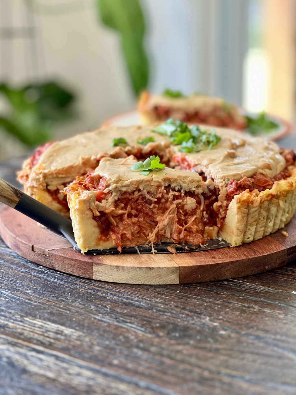 This Pie has all the traditional flavours everyone loves about Mexican food. The pulled jackfruit, which is the vegan chicken substitute is absolutely delicious with all the well-known spices of Mexico. The Risoni (orzo) pasta in the pie crust adds a surprising element to the dish. It is perfect because it stops the Mexican filling from making the base soggy. It also has a lovely crispy texture.