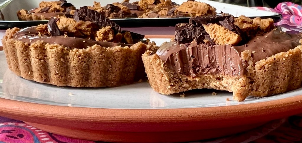 If you like, chop up a few pieces of vegan chocolate roughly. Sprinkle them over the top. Alternatively, you can grate some chocolate over the tarts. If you’re going to eat the tarts that day crush up some Biscoff biscuits over the top.