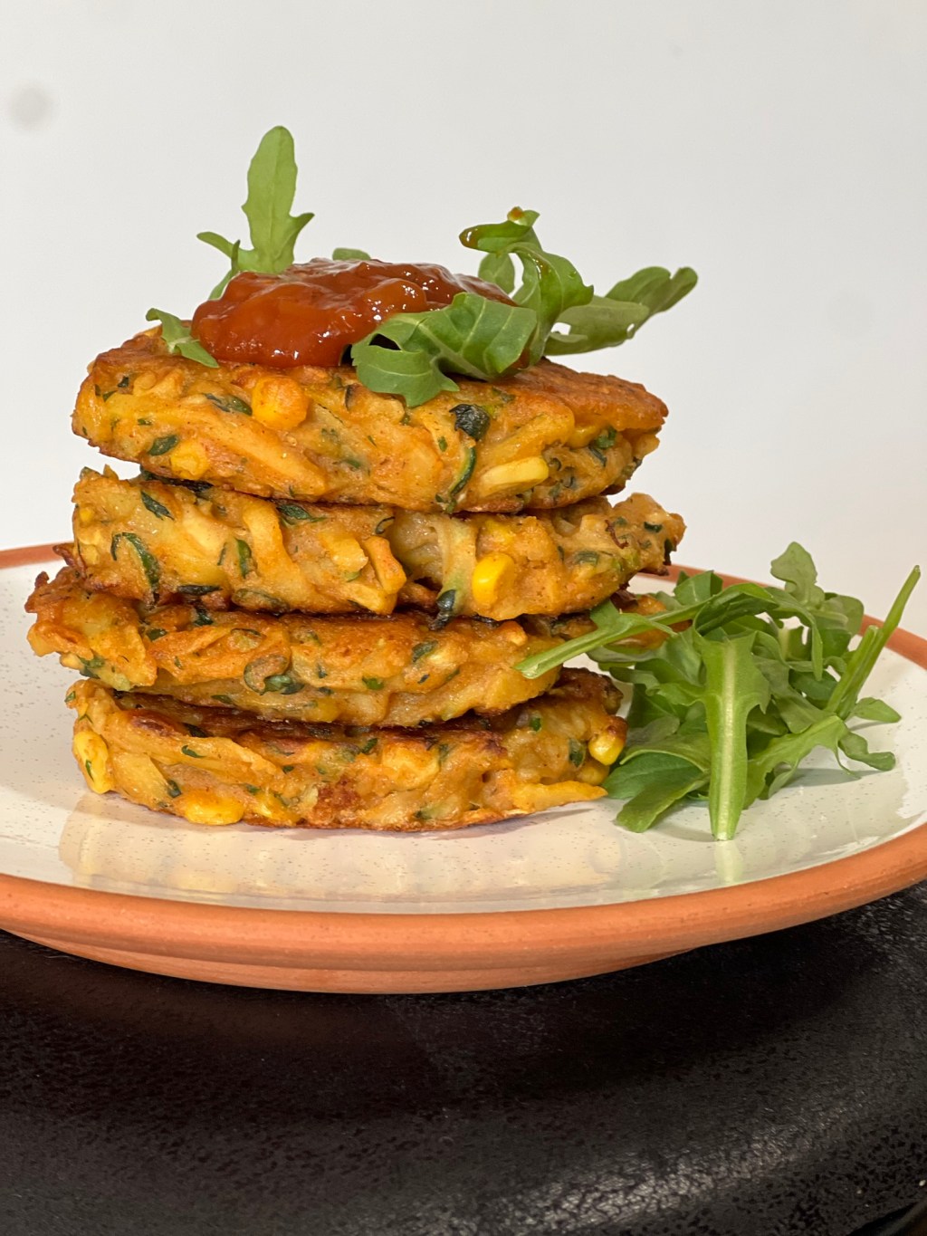 Place about 1/2 cup of batter in the frypan and cook both sides for about 5 -6 minutes each side. To test if they are cooked gently press down in the centre of the fritter to make sure it’s firm. If you think they are still gooey in the middle place them in a moderate oven for about 10 minutes. I finish the fritters in the oven or air fryer. This ensures they are completely cooked through.